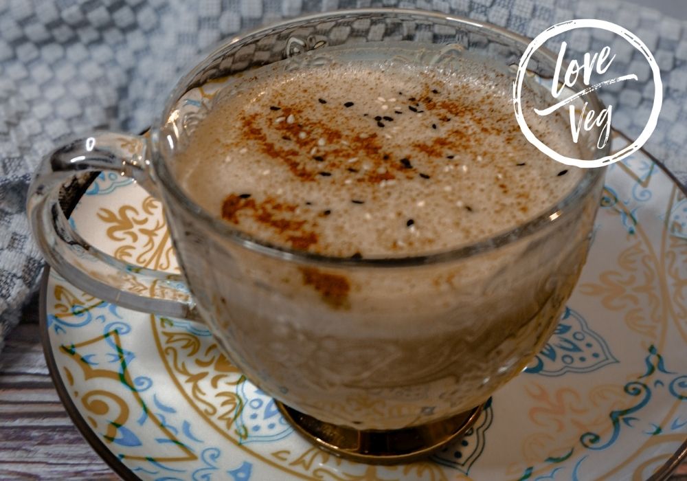 La preparo con leche vegetal y una cantidad generosa de tahini para darle cuerpo y ese sabor profundo que combina perfecto con el café caliente o frío.