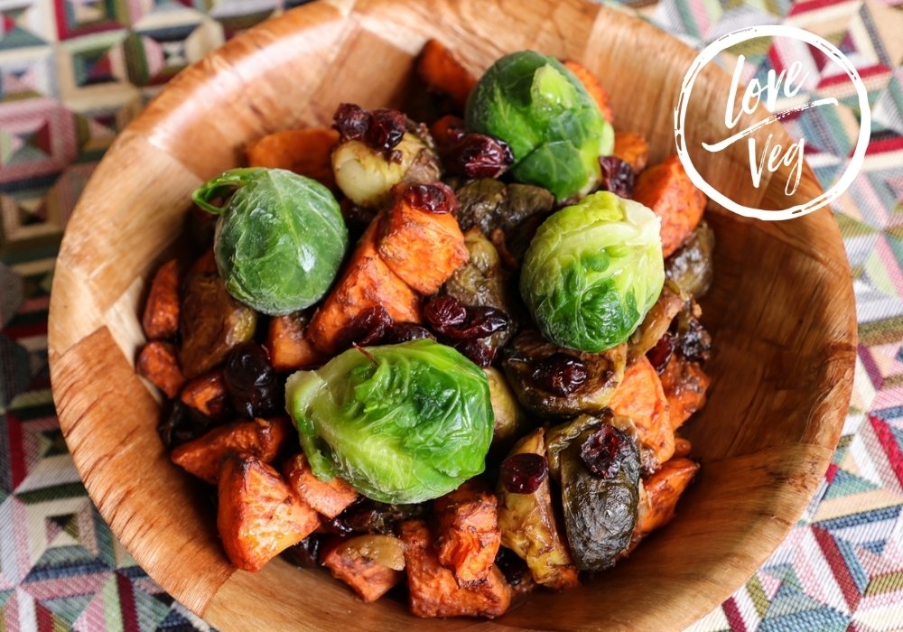 Una ensalada tibia que celebra el otoño: coles de Bruselas crujientes, camote asado, nueces y arándanos en perfecta armonía. Sencilla, elegante, colorida y llena de sabor para tu mesa festiva.
