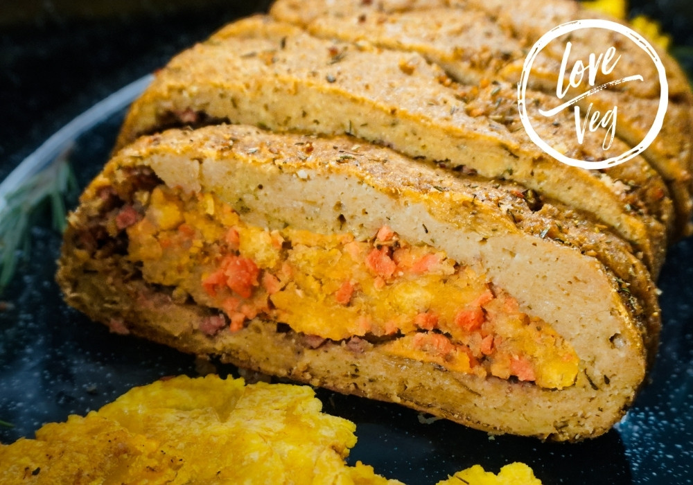 Rollo de pavo vegano relleno de mofongo con “bacon”