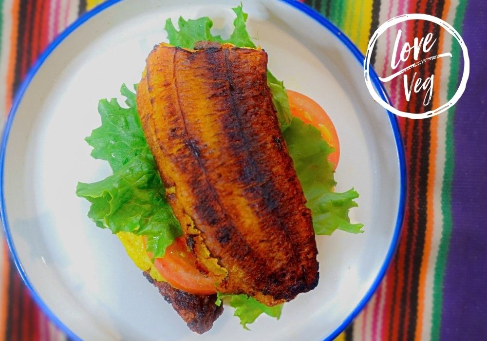 - Unta con aioli una cara del plátano frito, y coloca capas de seitan, tomate, cebolla, lechuga, y queso vegano. Coloca el otro plátano y prepárate para disfrutar de la crujencia de este platillo.