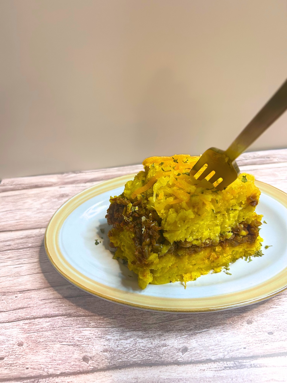 Para montar el pastelón, en una bandeja para hornear, extiende una capa uniforme del puré de plátano. Encima, coloca todo el guiso de lentejas. Finaliza con otra capa de puré de plátano. Por encima, cubre con el queso vegetal rallado.