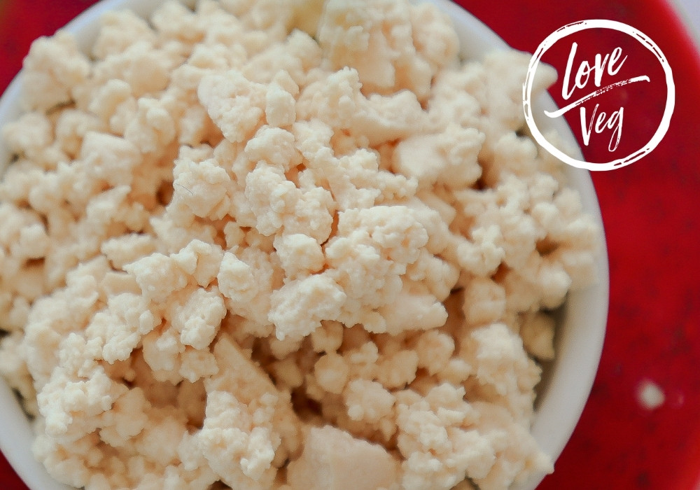 - Con un tenedor, desmenuza el tofu hasta que tenga una textura granulada.