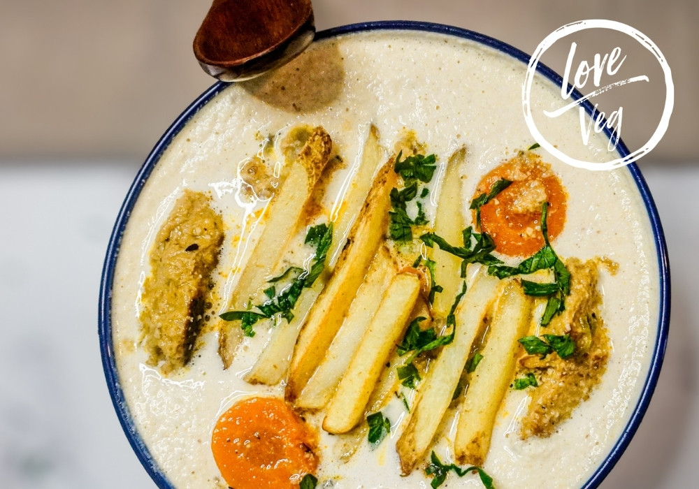 Tradicionalmente se prepara con carne, papas y verduras. En esta versión a base de plantas mantenemos los sabores clásicos de la sopa de maní boliviana, incorporando zanahoria, hierbas frescas y un pollo vegetal preparado con gluten de trigo.