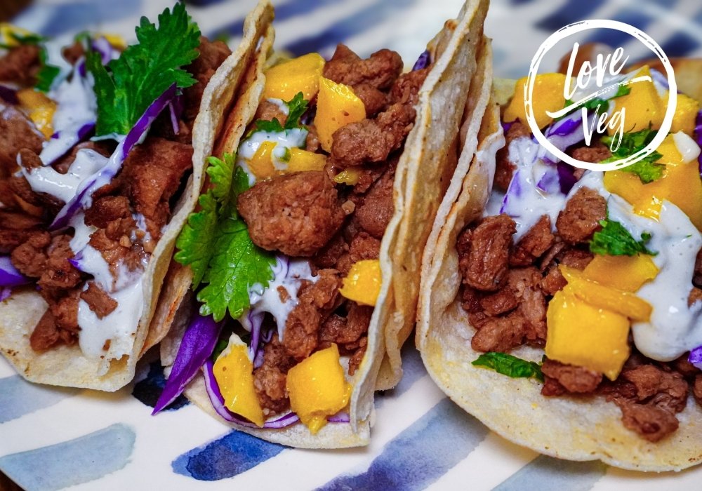 - Sirve en tortillas pequeñas y decora con kimchi vegano, repollo morado, crema ácida vegana, cilantro y un chorrito de limón.