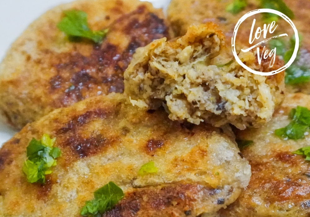 Coliflor dorada en sartén con especias que recrean la textura y apariencia de un filete de pescado a la plancha. Crujiente por fuera, suave por dentro, con ese toque marino gracias al alga nori.